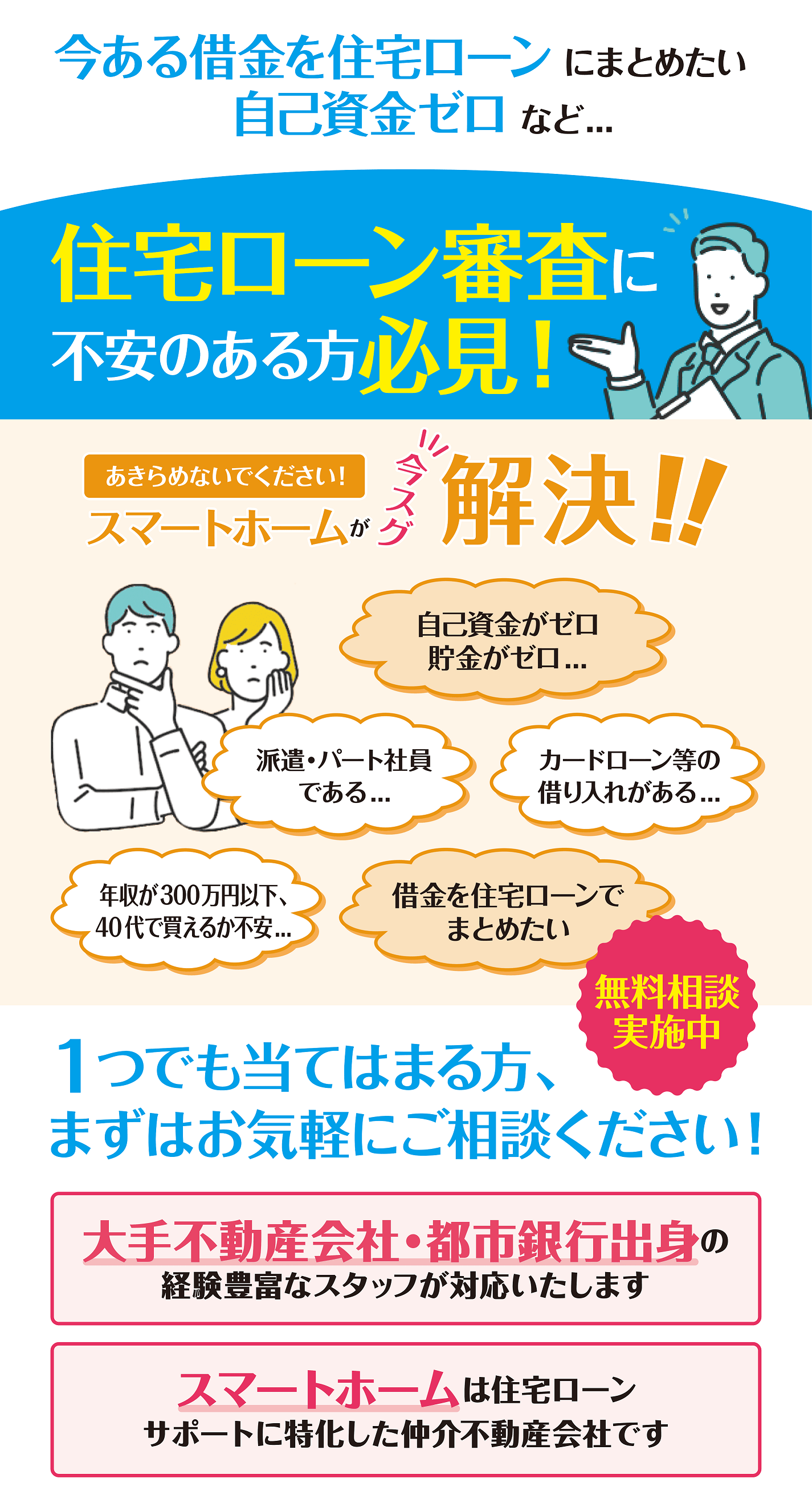 スマートホームはお客様の住宅ローンを全力でサポートします。住宅ローンのことでわからないことがあれば、スマートホームのスタッフにお気軽にお問い合わせください!